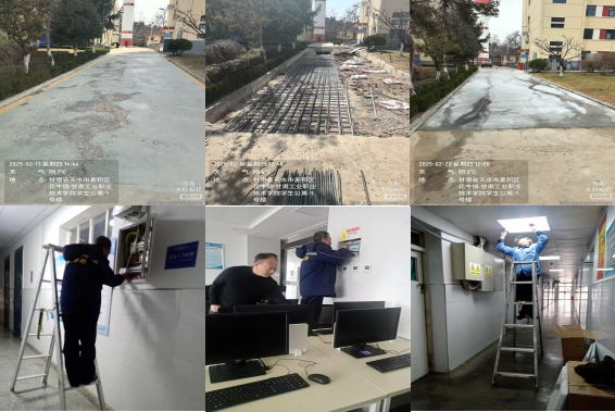 为保障校园安全有序运行,后勤部门成立专项工作组,对校园主干道路面、教学楼及宿舍电路设施开展“地毯式”排查。重点修复了主干道破损路面,更新维修教室及宿舍吊顶、照明设备,并完成全校路灯检修及更换工作,确保夜间照明全覆盖。