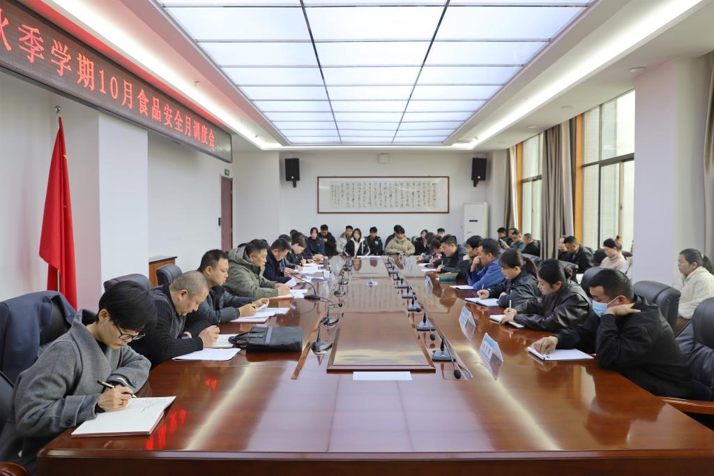 为持续强化校园食品安全管理,切实保障师生饮食安全与身体健康,10月22日,我校在图书馆四楼会议室组织召开了2025年秋季学期10月食品安全月调度会议。学校党委副书记、校长张利军出席会议并讲话,花牛镇市场监督管理所副所长易蓉蓉应邀到会指导。学校后勤管理处、校饮食服务中心、各餐饮承包公司和大宗食材供应商部门负责人以及校学生会生活权益部学生代表共同参加了会议。会议由学校党委常委、副校长胡森林主持。