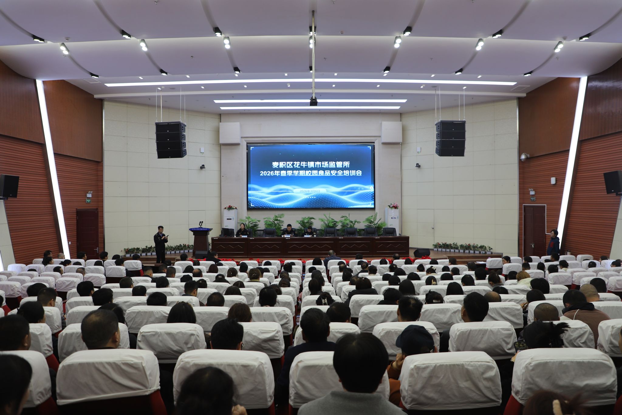 3月6日下午,由麦积区花牛镇市场监管所主办的“2026年春季学期校园食品安全培训会”在我校报告厅顺利举行。辖区学校、幼儿园及餐饮单位相关负责人共200余人参加。